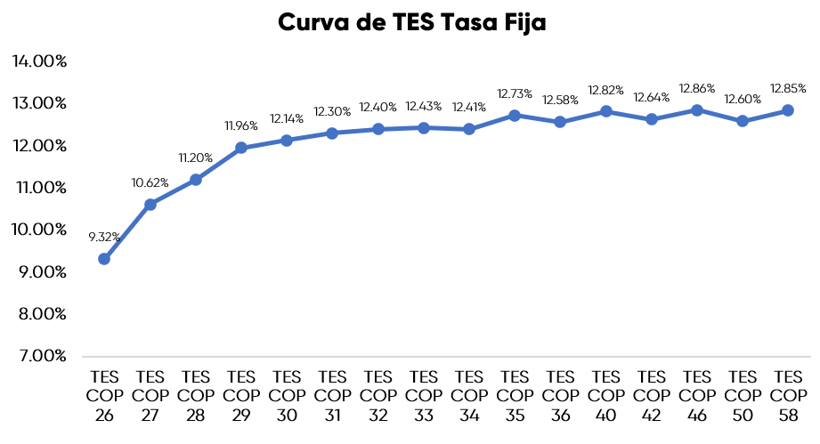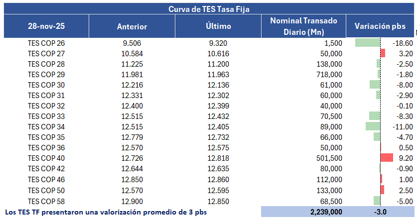 En la jornada anterior, la curva de TES tasa fija en Colombia registró un comportamiento positivo con una valorización promedio de 3 puntos básicos, con un volumen de negociación cercano a 2,2 billones de pesos, presentando un comportamiento mixto a lo largo de la curva. En el ámbito externo, los bonos del Tesoro de Estados Unidos negociaron sin muchos movimientos, tras el festivo del Día de Acción de Gracias en Estados Unidos y a que CME Group, el mayor operador bursátil del mundo, sufrió una interrupción que paralizó la negociación de futuros.