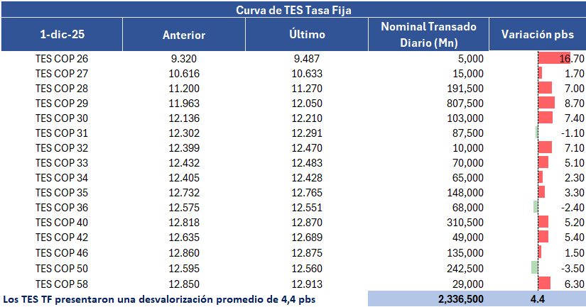 En la jornada anterior, la curva de TES tasa fija en Colombia registró un comportamiento positivo con una desvalorización promedio de 4,4 puntos básicos, con un volumen de negociación cercano a 2,3billones de pesos, presentando un comportamiento mixto a lo largo de la curva. En el ámbito externo, los bonos del Tesoro de Estados Unidos presentaron desvalorizaciones presionados por la debilidad de la deuda pública japonesa tras los comentarios del gobernador del Banco de Japón, Kazuo Ueda, quien señaló que las condiciones se estaban alineando para una posible alza de tasas.