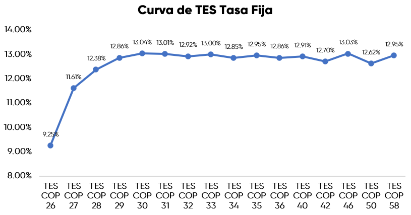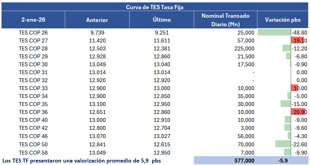 En la jornada anterior, la curva de TES tasa fija en Colombia registró un comportamiento positivo con una valorización promedio de 6 puntos básicos, con un volumen de negociación cercano a los 0,57 billones de pesos, presentando un comportamiento mixto a lo largo de la curva. En el frente externo, los bonos del Tesoro de Estados Unidos mostraron desvalorizaciones sin fuertes catalizadores.