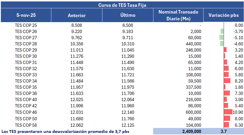 En la jornada anterior, la curva de TES tasa fija en Colombia registró un comportamiento negativo con una desvalorización promedio de 3,7 puntos básicos, con un volumen de negociación cercano a los 2,4 billones de pesos presentando un comportamiento mixto en la parte corta de la curva. En el ámbito externo, los bonos del Tesoro de Estados Unidos presentaron presentaron desvalorizaciones tras los datos de empelo privado ADP y el ISM Services.
