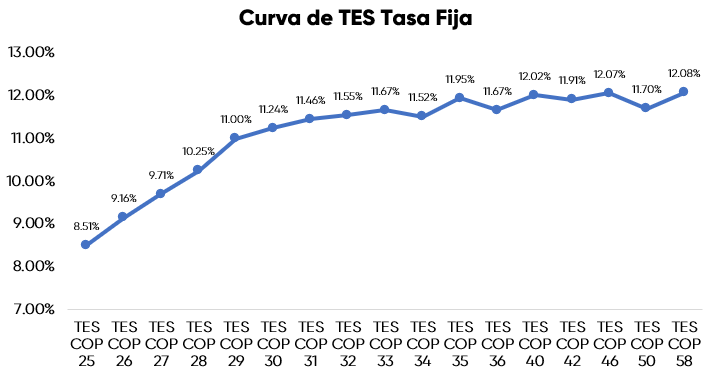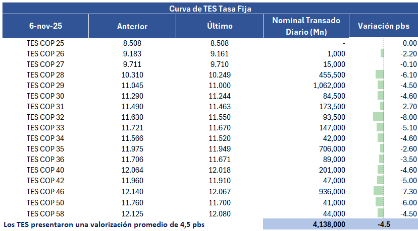 En la jornada anterior, la curva de TES tasa fija en Colombia registró un comportamiento positivo con una valorización promedio de 4,5 puntos básicos, con un volumen de negociación cercano a los 4,1 billones de pesos. En el ámbito externo, los bonos del Tesoro de Estados Unidos también presentaron valorizaciones ante la preocupación por el debilitamiento del mercado laboral, así como por la perspectiva de una mayor incertidumbre económica causada por el cierre parcial del Gobierno.