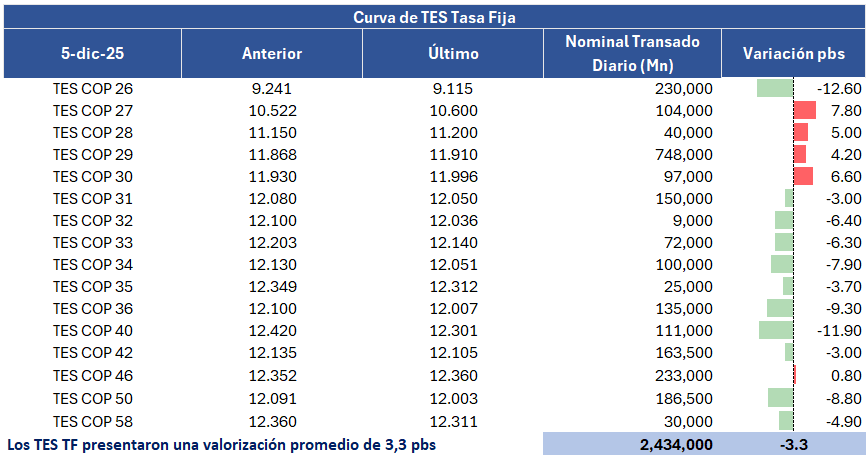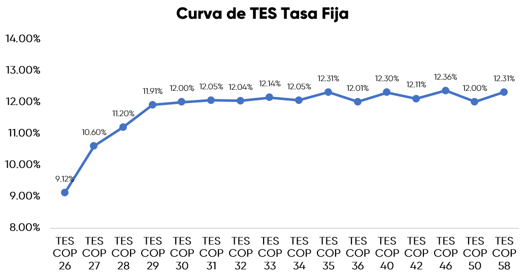 En la jornada hábil anterior, la curva de TES tasa fija en Colombia registró un comportamiento positivo con una valorización promedio de 3,3 puntos básicos, con un volumen de negociación cercano a 2,4 billones de pesos, presentando un comportamiento mixto en la parte corta d la curva. En el ámbito externo, los bonos del Tesoro de Estados Unidos presentaron desvalorizaciones a medida que se acerca la fecha de la reunión de la Reserva Federal. El lunes el mercado de deuda pública en Colombia se mantuvo cerrado por el día festivo, no obstante los bonos del Tesoro si cotizaron en EEUU.