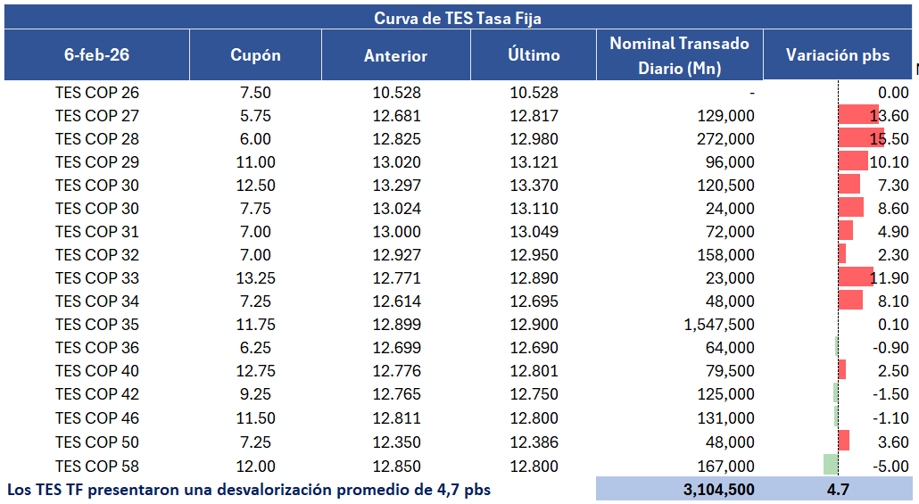 En la jornada anterior, la curva de TES tasa fija en Colombia registró un comportamiento negativo con una desvalorización promedio de 4,7 puntos básicos, con un volumen de negociación cercano a 3,1 billones de pesos, mostrando un comportamiento mixto en la parte media y larga de la curva. Por su parte los bonos del Tesoro de Estados Unidos registraron valorizaciones con el mercado reaccionando a los datos laborales más recientes y a la espera de los datos oficiales de empleo esta semana.