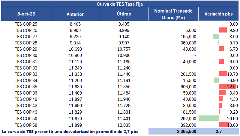 En la jornada anterior, la curva de TES tasa fija en Colombia registró un comportamiento negativo con una desvalorización promedio de 2,7 puntos básicos, con un volumen de negociación cercano a los 2,3 billones de pesos, presentando un comportamiento mixto a lo largo de la curva. En el ámbito externo, los bonos del Tesoro de Estados Unidos también presentaron algunas valorizaciones en una jornada marcada por la subasta de US$39.000 millones de bonos a diez años, y la presentación de las minutas de la FED.