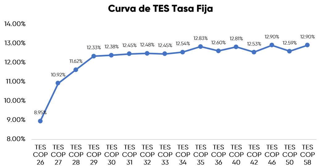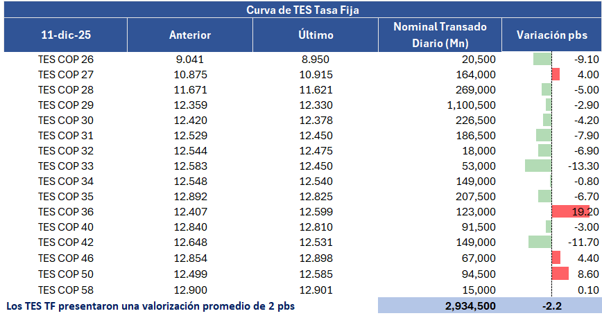 En la jornada anterior, la curva de TES tasa fija en Colombia registró un comportamiento positivo con una valorización promedio de 2,2 puntos básicos, con un volumen de negociación cercano a 2,9 billones de pesos, presentando un comportamiento mixto a lo largo de la curva. En el ámbito externo, los bonos del Tesoro de Estados Unidos presentaron algunas valorizaciones, a medida que el mercado continua evaluando las decisiones de la Fed.