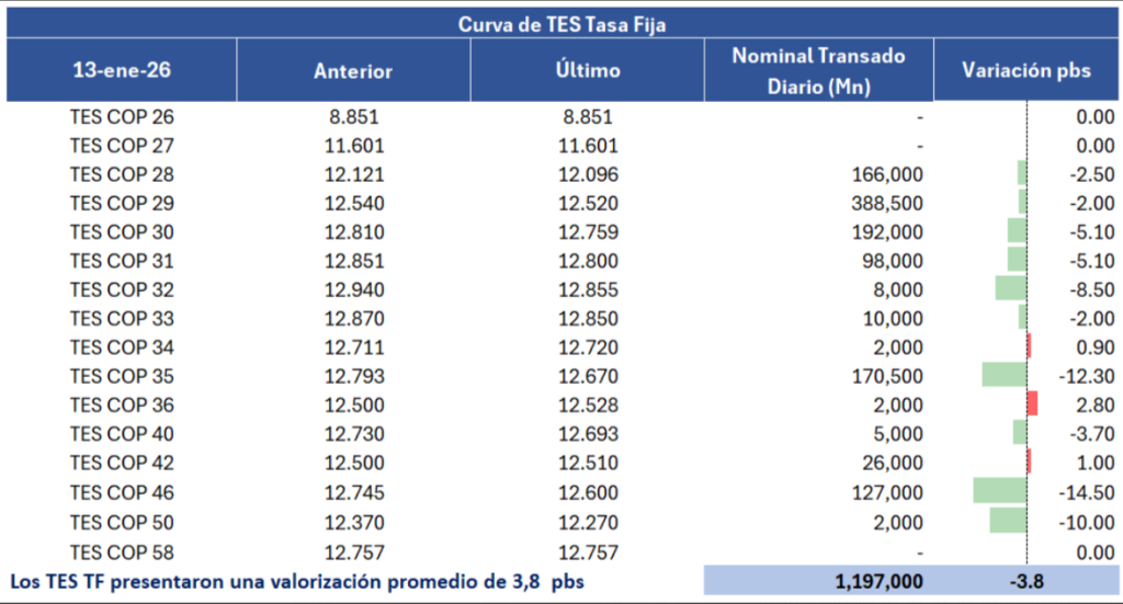 En la jornada anterior, la curva de TES tasa fija en Colombia presentó un desempeño positivo, con una valorización promedio de 4,6 puntos básicos y un volumen de negociación cercano a $1,2 billones, presentando un comportamiento mixto en la parte media y larga de la curva. En el frente externo, los bonos del Tesoro de Estados Unidos también registraron valorizaciones en una sesión marcada por los datos de inflación a cierre de 2025.