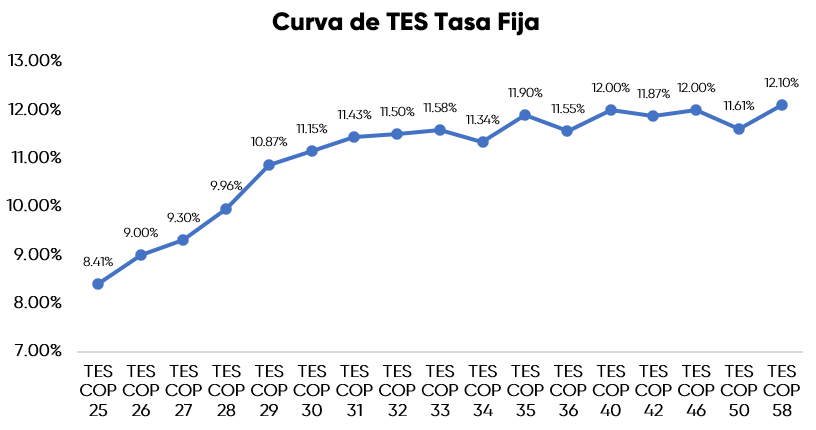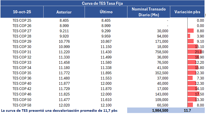 En la jornada anterior, la curva de TES tasa fija en Colombia registró un comportamiento negativo con una desvalorización promedio de 11,7 puntos básicos, con un volumen de negociación cercano a los 1,9 billones de pesos, presentando un comportamiento mixto en la parte media y larga de la curva. En el ámbito externo, los bonos del Tesoro de Estados Unidos presentaron fuertes valorizaciones tras las declaraciones del presidente Trump amenazando con un aumento masivo de los aranceles sobre las importaciones procedentes de China.