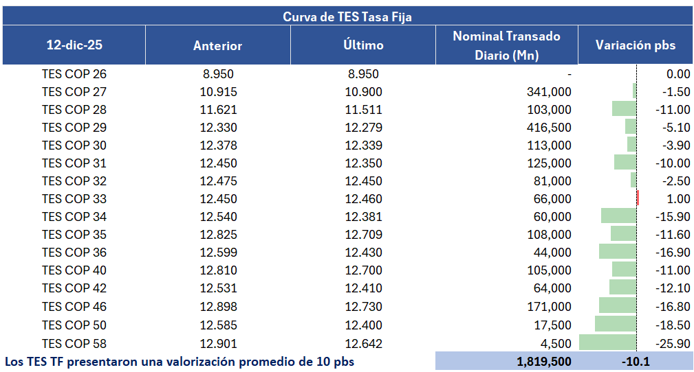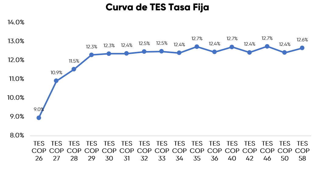 En la jornada anterior, la curva de TES tasa fija en Colombia registró un comportamiento positivo con una valorización promedio de 10 puntos básicos, con un volumen de negociación cercano a 1,8 billones de pesos. En el ámbito externo, los bonos del Tesoro de Estados Unidos presentaron algunas valorizaciones, a medida que el mercado continua evalúa los comentarios de los miembros de la FED a cerca de sus posiciones tras la decisión de la junta la semana pasada.