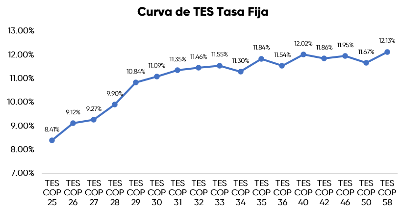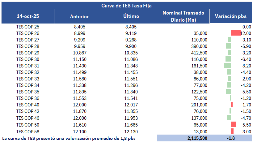 En la jornada anterior, la curva de TES tasa fija en Colombia registró un comportamiento positivo con una valorización promedio de 1,7 puntos básicos, con un volumen de negociación cercano a los 2,1 billones de pesos, presentando un comportamiento mixto en la parte corta y larga de la curva. En el ámbito externo, los bonos del Tesoro de Estados Unidos presentaron algunas valorizaciones tras los comentarios de Jerome Powell.