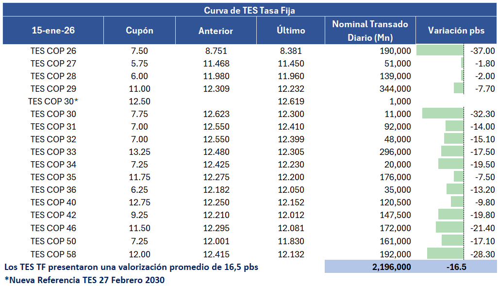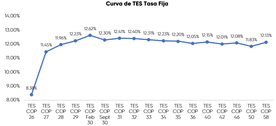En la jornada anterior, la curva de TES tasa fija en Colombia registró un comportamiento positivo con una valorización promedio de 16 puntos básicos, con un volumen de negociación cercano a 2,2 billones de pesos. En el ámbito externo, los bonos del Tesoro de Estados Unidos presentaron desvalorizaciones en la jornada a medida que disminuyen las expectativas de que la Reserva Federal recorte las tasas de interés en el corto plazo.