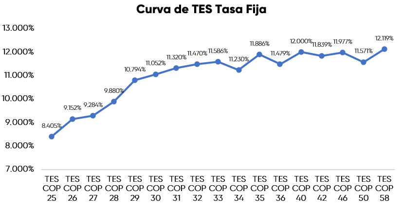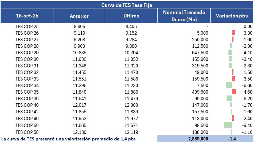 En la jornada anterior, la curva de TES tasa fija en Colombia registró un comportamiento positivo con una valorización promedio de 1,4 puntos básicos, con un volumen de negociación cercano a los 2,8 billones de pesos, presentando un comportamiento mixto a lo largo de la curva. En el ámbito externo, los bonos del Tesoro de Estados Unidos también presentaron algunas valorizaciones.