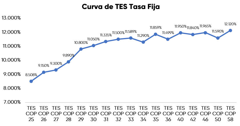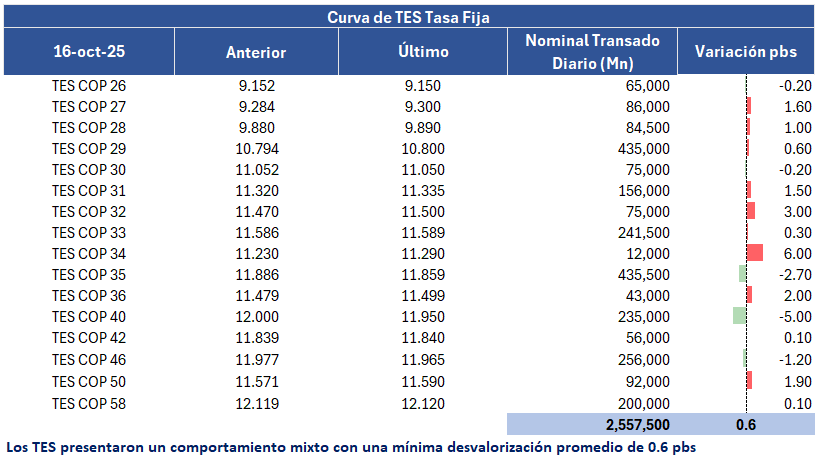 En la jornada anterior, la curva de TES tasa fija en Colombia registró un leve comportamiento negativo con una desvalorización promedio de 0,7 puntos básicos, con un volumen de negociación cercano a los 2,5 billones de pesos, presentando un comportamiento mixto a lo largo de la curva. En el ámbito externo, los bonos del Tesoro de Estados Unidos también presentaron algunas valorizaciones.