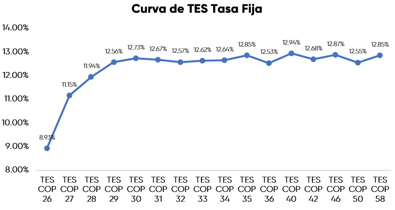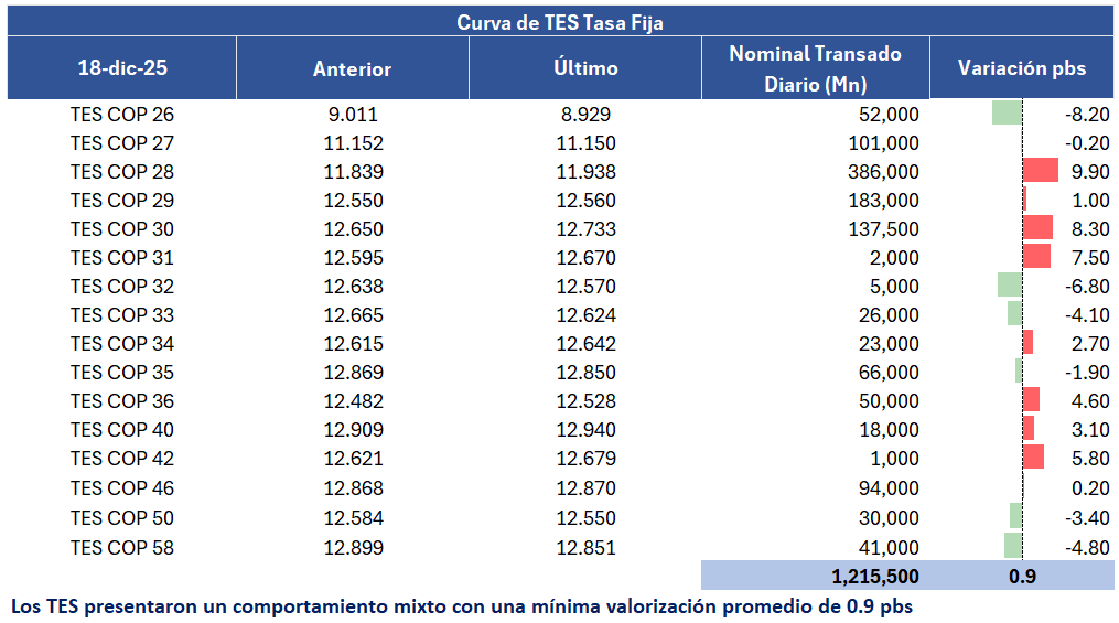 En la jornada anterior, la curva de TES tasa fija en Colombia registró un leve comportamiento negativo con una desvalorización promedio de 0,9 puntos básicos, con un volumen de negociación cercano a 1,2 billones de pesos, presentando un comportamiento mixto a lo largo de la curva. En el frente externo, los bonos del Tesoro de Estados Unidos mostraron valorizaciones tras la presentación de los datos de inflación en la jornada.