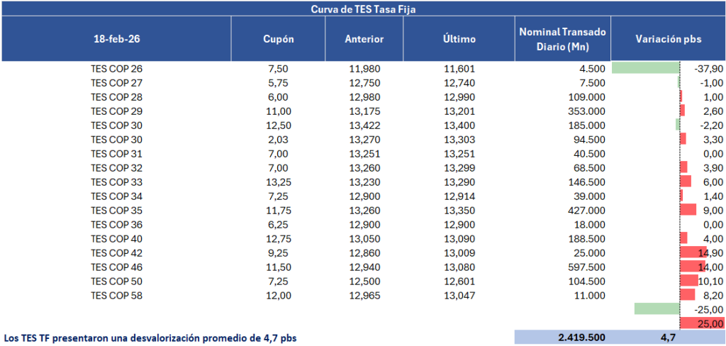 Banco de Bogotá: informó que el 18 de febrero de 2026 culminó exitosamente la operación de recompra parcial de su Bono Subordinado con vencimiento el 12 de mayo de 2026, en los términos y condiciones previamente anunciados el pasado 20 de enero de 2026. La operación se desarrolló en dos etapas: un primer tramo (Early Tender), que finalizó el 2 de febrero de 2026, y un segundo tramo (Late Tender), que concluyó el día de hoy, en el que se recibieron ofertas por US$1,900,000, equivalente al 0.18% de los bonos en circulación.