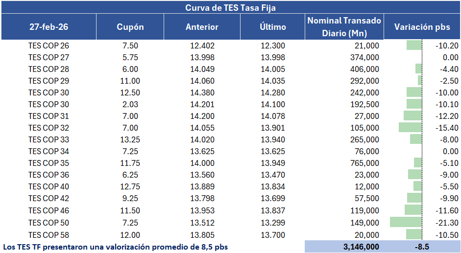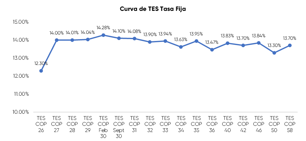 En la jornada anterior, la curva de TES tasa fija en Colombia registró un comportamiento positivo con una valorización promedio de 8,5 puntos básicos, con un volumen de negociación de 3,15 billones de pesos. Cierre semanal con algunas valorizaciones durante el viernes para los mercados de renta fija y donde los TES TF alcanzaron valorizaciones cercanas a los ocho puntos básicos en promedio. Sin embargo, fue una semana negativa a raíz del continuo stress en el escenario fiscal y los resultados de las encuestas políticas a nivel local. Durante la semana se espera se mantenga la volatilidad y no se anticipa un mercado muy positivo previo a las elecciones del próximo fin de semana.