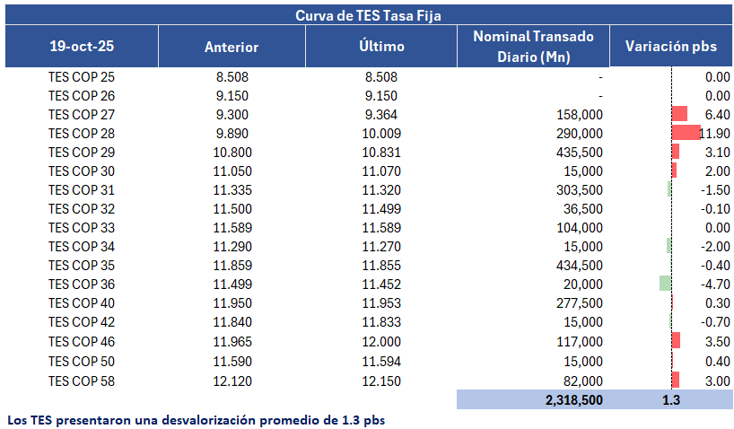 En la jornada anterior, la curva de TES tasa fija en Colombia registró un leve comportamiento negativo con una desvalorización promedio de 1,3 puntos básicos, con un volumen de negociación cercano a los 2,3 billones de pesos, presentando un comportamiento mixto a lo largo de la curva. En el ámbito externo, los bonos del Tesoro de Estados Unidos también presentaron desvalorizaciones a medida que el mercado calmaba el temor por la tensión comercial con China y la calidad crediticia en los bancos estatales.