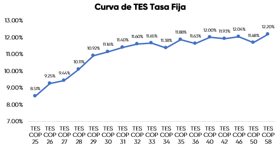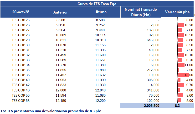 En la jornada anterior, la curva de TES tasa fija en Colombia registró un leve comportamiento negativo con una desvalorización promedio de 8,3 puntos básicos, con un volumen de negociación cercano a los 2,0 billones de pesos. En el ámbito externo, los bonos del Tesoro de Estados Unidos presentaron valorizaciones en la jornada a medida que el mercado mantiene la cautela dado que el Gobierno federal estadounidense permanece cerrado.