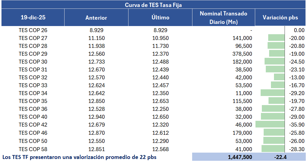 En la jornada anterior, la curva de TES tasa fija en Colombia registró un comportamiento positivo con una desvalorización promedio de 22,4 puntos básicos, con un volumen de negociación cercano a 1,4 billones de pesos, tras la colocación de 23 billones de pesos por parte del Ministerio de Hacienda y Crédito Publico con un inversionista extranjero. En el frente externo, los bonos del Tesoro de Estados Unidos mostraron valorizaciones