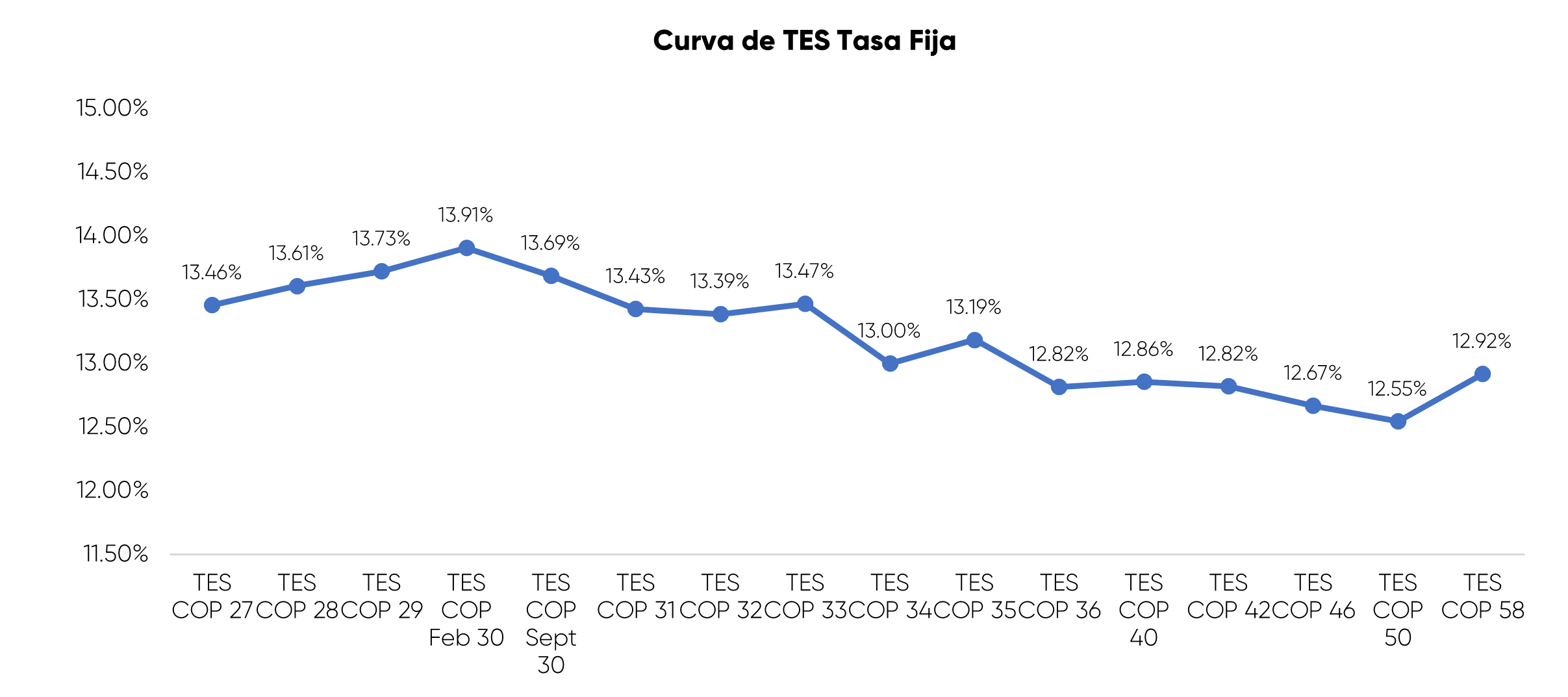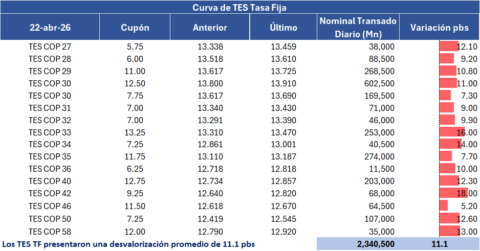 En la jornada anterior, los TES tasa fija en Colombia registraron un comportamiento de desvalorización, con una variación promedio de 11 pbs y un volumen de negociación cercano a COP 2,34 billones. La subasta de TES UVR cerró con una adjudicación de COP 601 mil millones, frente a una oferta de COP 1.4 billones. La subasta tuvo una caída en las tasas de corte frente a las del 8 de abril, con un cambio promedio de -50 pbs.
