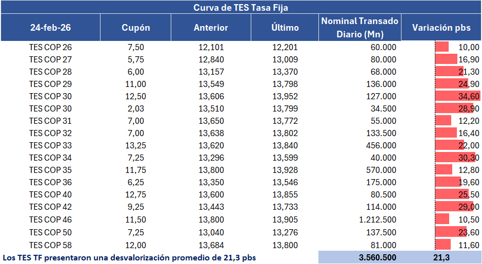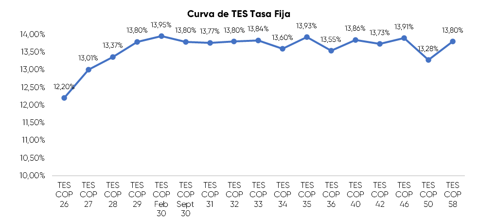 En la jornada anterior, la curva de TES tasa fija en Colombia registró un comportamiento negativo con una desvalorización promedio de 21,3 puntos básicos, con un volumen de negociación de 3,56 billones de pesos. La incertidumbre fiscal y política sigue presionando la curva de deuda publica con una nueva sesión negativa de mas de 20 puntos básicos. Ayer se realizó la subasta de tco´s semanal con un monto aprobado de COP 900 mil millones y una tasa de corte de 13,05% lo que evidentemente seguirá presionando la parte corta y reflejando la incertidumbre y el nerviosismo actual de mercado.