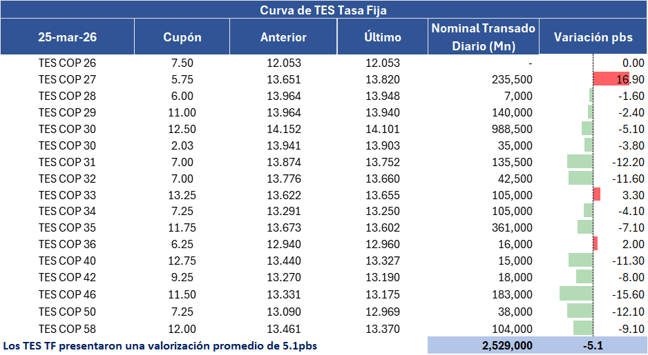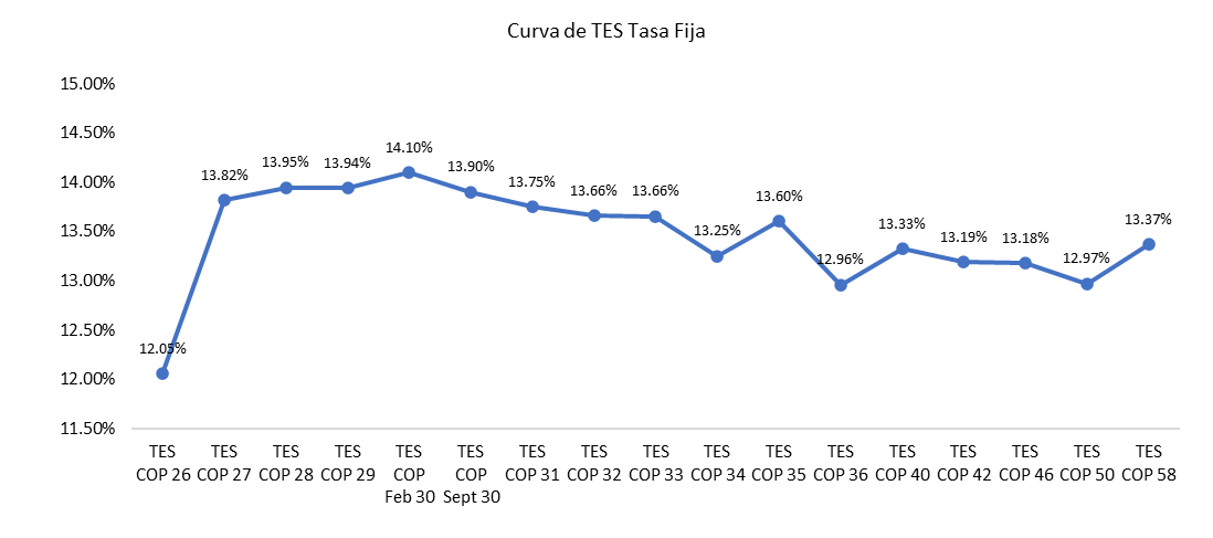 En la jornada anterior, la curva de TES tasa fija en Colombia registró un comportamiento de valorización promedio de 5,1 puntos básicos y un volumen de negociación de COP 2,53 billones, mejorando frente a los volúmenes de las anteriores jornadas. Además, se subastó TES del 2030 que adjudico 1.5 billones de pesos. Además, tuvo corte en el nivel de 14.03%, que, aunque continúa siendo una tasa alta de endeudamiento para el gobierno, estuvo por debajo de la tasa de cierre que se encontró en 14.10% (7 puntos básicos por encima).