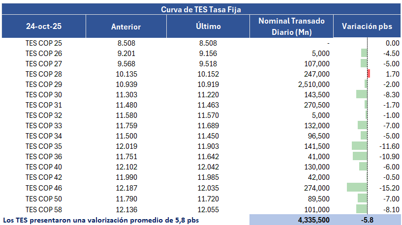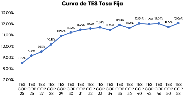 En la jornada anterior, la curva de TES tasa fija en Colombia registró un comportamiento positivo con una valorización promedio de 5,8 puntos básicos, con un volumen de negociación cercano a los 4,3 billones de pesos, presentando un comportamiento mixto en la parte corta de la curva. En el ámbito externo, los bonos del Tesoro de Estados Unidos también presentaron desvalorizaciones en una jornada marcada por la presentación de los datos de inflación.