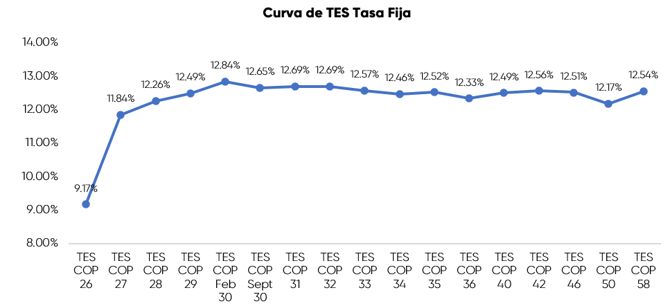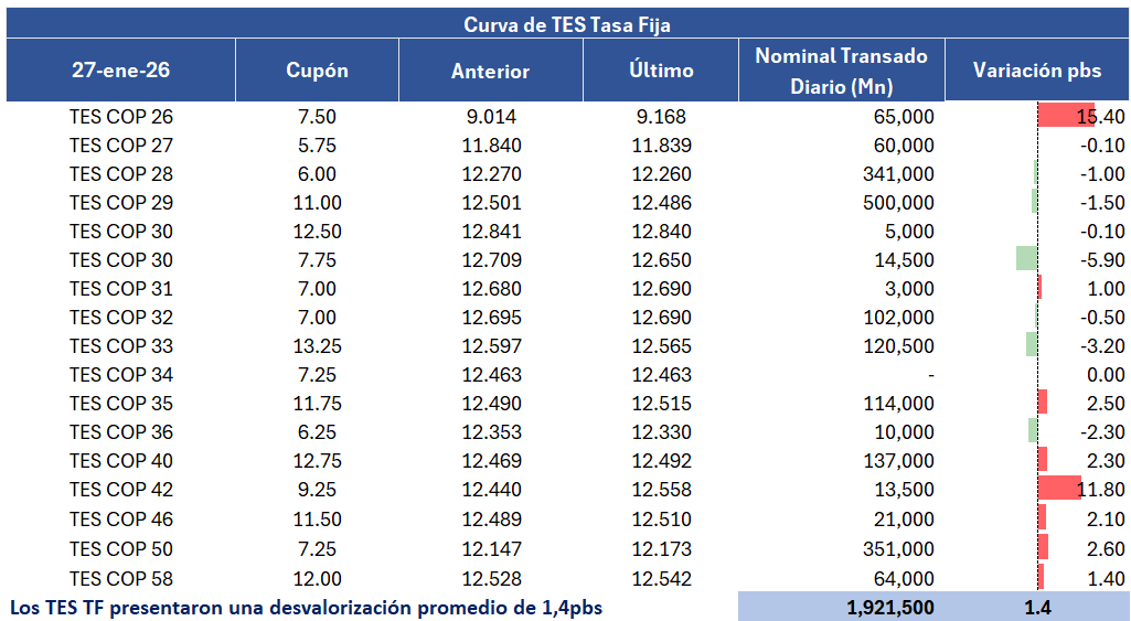En la jornada anterior, la curva de TES tasa fija en Colombia registró un comportamiento negativo con una desvalorización promedio de 15 puntos básicos, con un volumen de negociación cercano a 1,9 billones de pesos, presentando un comportamiento mixto a lo largo de la curva. Por su parte los bonos del Tesoro de Estados Unidos registraron algunas desvalorizaciones en una sesión marcada por el inicio de la reunión de la FED.