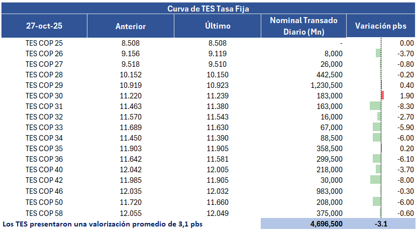 En la jornada anterior, la curva de TES tasa fija en Colombia registró un comportamiento positivo con una valorización promedio de 3,1 puntos básicos, con un volumen de negociación cercano a los 4,7 billones de pesos, presentando un comportamiento mixto en la parte corta de la curva. En el ámbito externo, los bonos del Tesoro de Estados Unidos también presentaron algunas valorizaciones a la espera de la reunión de la FEd que inicia el día de hoy.