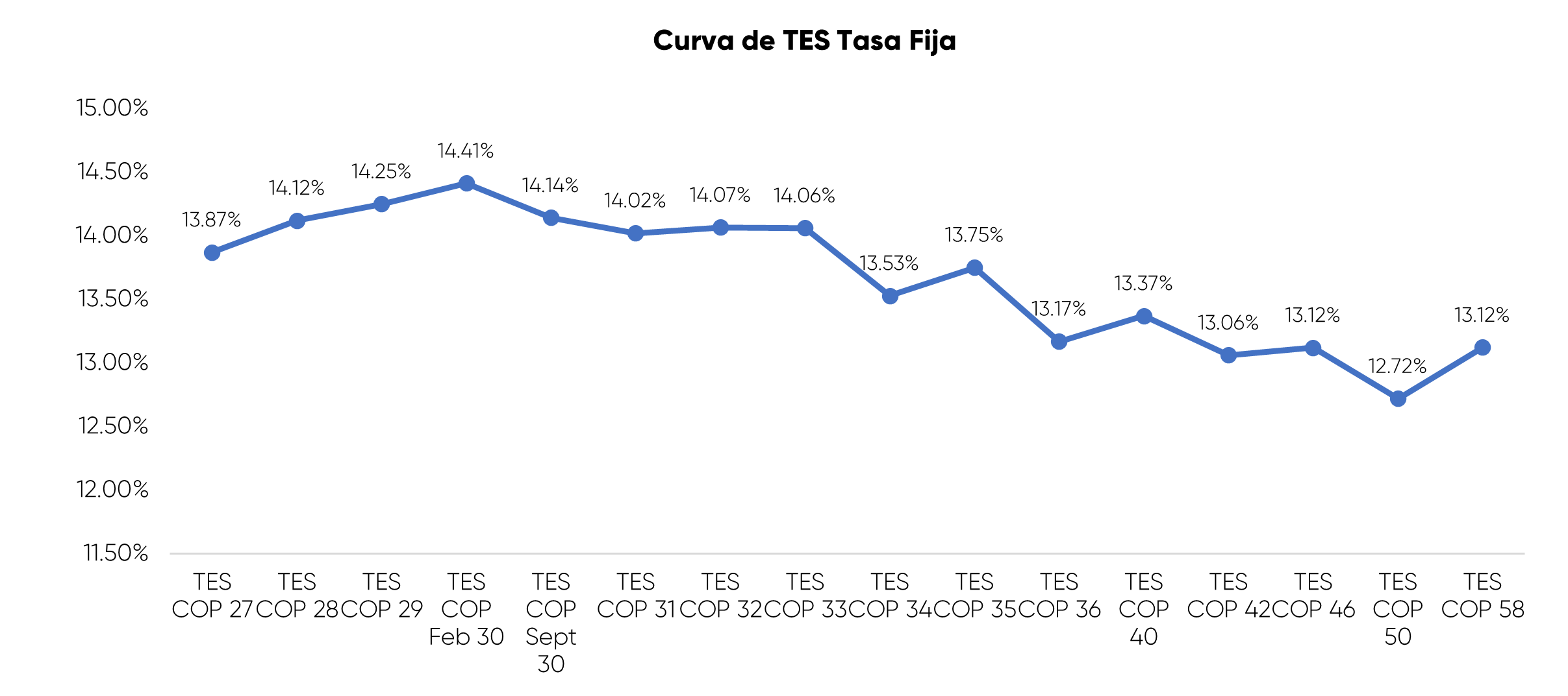 En la jornada anterior, los TES tasa fija en Colombia registraron un comportamiento de desvalorización, con una variación promedio de 16.8 pbs y un volumen de negociación cercano a COP 2,84 billones. Desvalorización que se concentró principalmente en la parte corta y media de la curva, siendo los nodos del 2032 y 2027 los de mayor subida en su tasa con 27 y 25 puntos básicos, respectivamente. Emisión de TES TF con un bid to cover de 3.7 con tasas de corte para los nodos del 2030, 2035, 2040 y 2058 de 14.26%, 13.62%, 13.34% y 13.06%, respectivamente.
