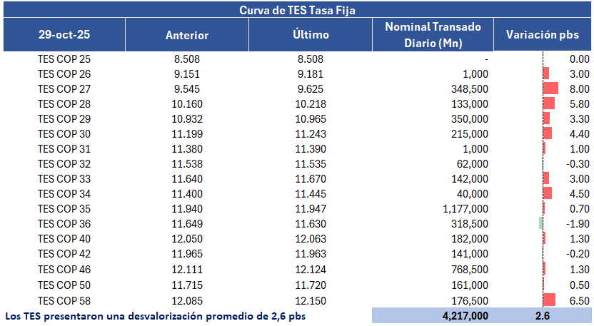 En la jornada anterior, la curva de TES tasa fija en Colombia registró un comportamiento negativo con una desvalorización promedio de 2,6 puntos básicos, con un volumen de negociación cercano a los 4,2 billones de pesos, presentando un comportamiento mixto en la parte media de la curva. En el ámbito externo, los bonos del Tesoro de Estados Unidos presentaron desvalorizaciones en la jornada, tras el discurso de Powell que dejó dudas sobre el recorte de tasas en Diciembre.