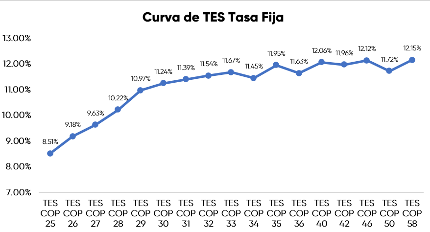 El Ministerio de Hacienda retomó esta semana las subastas de TES tasa fija con la colocación que había sido aplazada hace más de un mes por el canje de títulos. En esta ocasión se ofrecieron las referencias On the Run, registrándose tasas de corte de 10,85% para los TES 2029, 11,85% para los 2035, 11,99% para los 2040, 12,03% para los 2046 y 12,06% para los 2058. La subasta recibió demandas por $4,45 billones y adjudicó $1,2 billones, lo que dejó un bid-to-cover de 5,6 veces, evidenciando una sólida demanda por los títulos en pesos, especialmente en los plazos medios y largos de la curva.